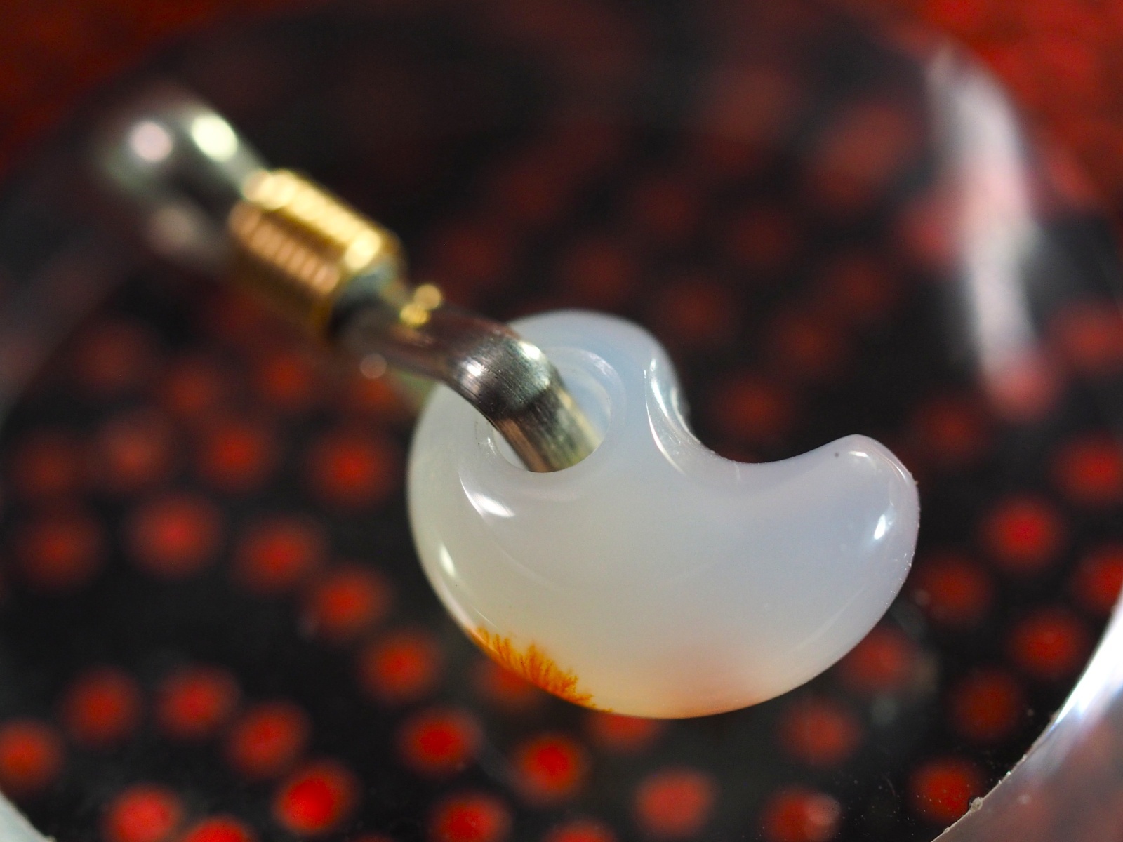 「色のいいヒスイならカタチと研磨はどうでも売れる」と同業者から聞いたことがありますが、どんなヒスイであっても私にとってオンリーワンの愛すべき存在で、一期一会の覚悟で徹底的に作り込み、紐孔の縁や内部まで研磨しています。