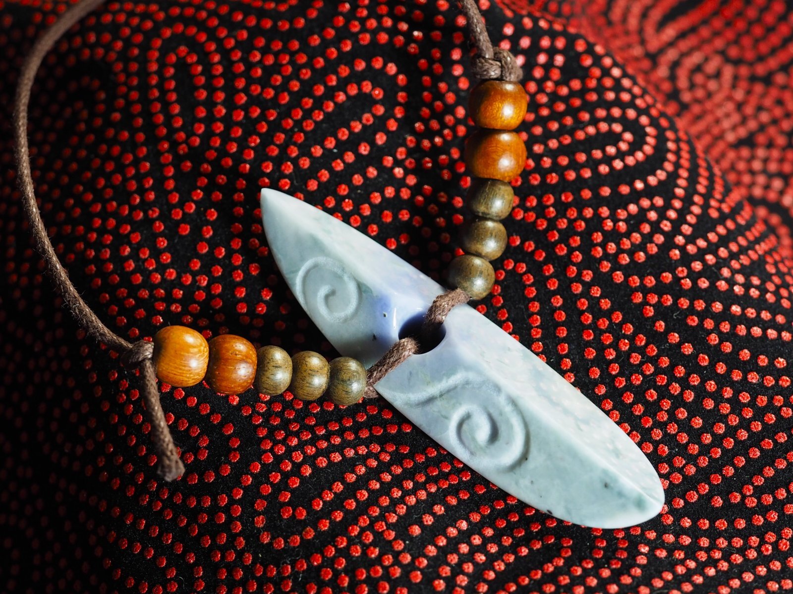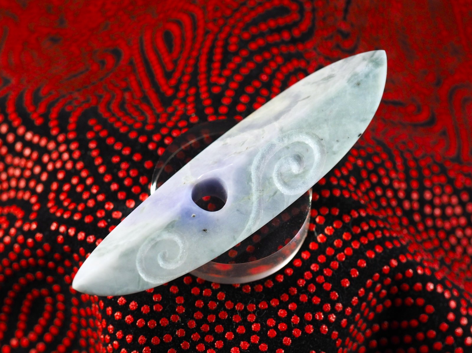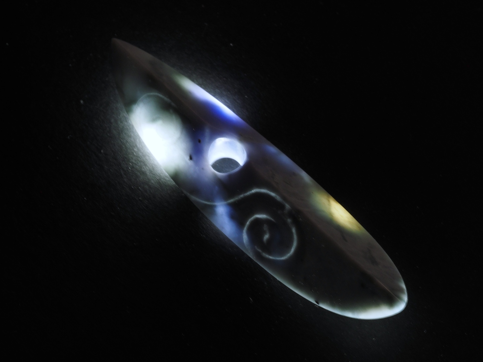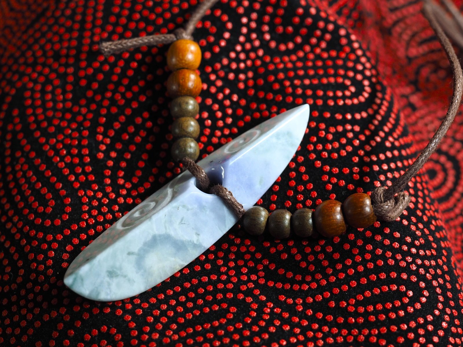 ふつうの職人なら安物のストラップの材料にする端材から、縄文中期の大珠を現代風に洗練させて小型化したペンダントですが、渦巻くような模様と対になるようにラセンを線刻しました。